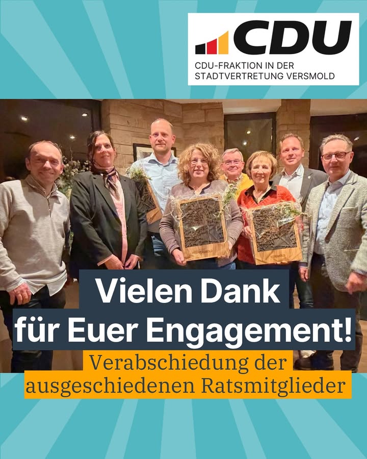 In der vergangenen Woche haben wir zum Ende der letzten Wahlperiode die Mitglieder der CDU-Fraktion verabschiedet, die nicht erneut kandidiert haben. Wir sagen DANKE! 🙏 für Euer besonderes kommunalpolitisches Engagement für unsere Stadt! 🙏 Marianne Kampwerth🙏Marianne war von 1999 bis 2020 Mitglied der Stadtvertretung und in den letzten 5 Jahren hat sie sich noch als sachkundige Bürgerin eingebracht. In diesen 26 Jahren hat sie alle Höhen und Tiefen miterlebt, viel für Versmold vorangebracht und stets neue Impulse gegeben. Besonders die Themen Schule, Kinder & Jugend und Sport lagen ihr am Herzen. 🙏Wolfgang Redecker🙏Wolfgang war seit 2014 dabei und hat als gelernter Elektromeister seine Fachkenntnisse z.B. bei der Kläranlage oder den Stadtwerken einbringen können. Und besonders eingesetzt hat er sich immer für seinen Heimatortsteil Peckeloh. 🙏Matthias Ruch🙏Matthias hat in seinen 5 Jahren im Rat gleich von Anfang an als Sprecher im BIGKISS Verantwortung übernommen und sich für seine Themen Schule und Kinderbetreuung stark gemacht. 🙏Franziska Ruwisch🙏Auch Franziska gehörte für 5 Jahre dem Rat an. Als zweifache Mutter hat auch sie sich immer für Familienthemen eingesetzt und dabei auch immer ihren Wahlkreis Peckeloh im Blick gehabt. 🙏Yvonne Hankte🙏Auch Yvonne gehörte für ihren Wahlkreis Oesterweg dem Rat für 5 Jahre an. Als Mutter einer Tochter lagen ihr ebenfalls die Themen Kita, Schule und Jugend besonders am Herzen. Aber auch auf Personalthemen hatte sie immer einen Blick. Sie wird sich weiterhin als sachkundige Bürgerin einbringen. Danke für Eure Arbeit und das gute Miteinander! Und wir freuen uns drauf, einige von Euch in der Zukunft sicherlich auch wieder in unserem Team zu haben! #versmold #kommunalpolitik #cdu #ehrenamt @michaelmeyerhermann
