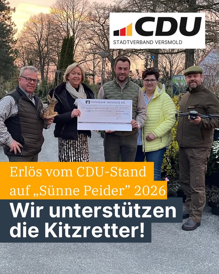 CDU spendet für den Hegering in Versmold Die stolze Summe von 620? konnte als Ergebnis des St.-Petri-Markt-Standes der CDU an den Hegering Versmold e.V. übergeben werden.Auf Grund des warmen Wetters hatte sich die CDU Versmold spontan entschieden zusätzlich zu den üblichen Heißgetränken auch kalte Erfrischungen anzubieten. Wie der Gewinn von 620? zeigt, eine gute Entscheidung. Mit viel Spaß wurde bei guten Gesprächen ein ordentlicher Umsatz gemacht.Der Versmolder Hegering beteiligt sich seit 2019 an der Kitzrettung. Gut 20 Frühaufsteher haben in den vergangenen Jahren insgesamt bereits 999 Kitze vor den Mähwerken der Landwirte gerettet. Bereits vor Sonnenaufgang gehen Gruppen von 4 Personen über die Wiesen und werden von einer Drohne mit hochempfindlicher Wärmebildkamera begleitet. Die Technik ist bereits in den wenigen Jahren enorm besser und schneller geworden. Heute wird für die Kontrolle ein Hektar in gut 10 min abgeflogen. Im Jahr 2025 wurden so ca. 1000 Hektar in Versmold und den umliegenden Ortsteilen abgeflogen und kontrolliert. Dies geschah in 71 Einsätze mit jeweils 3 Teams aus freiwilligen Helfern. Nicht nur Jäger, sondern auch andere Naturfreunde sind daran beteiligt. Ein Spaziergang im Morgengrauen durch das taufeuchte Gras lasse die schönsten Bilder entstehen, so Klaus Meyer. Schmunzelnd fügt er hinzu, die Aktionen würden ja immer an Schönwettertagen stattfinden.Die Spende soll für Verlängerungen der Drohnenführerscheine verwendet werden.Sehr gerne unterstützt die CDU in Versmold dieses so wichtige ehrenamtliche Projekt! #versmold #cdu #spende #kitzrettung #hegering