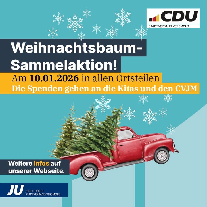 🎄Ihr schmeißt Euren ausgedienten Tannenbaum raus - wir holen ihn ab! 🎄Denn auch dieses Jahr findet wieder unsere Weihnachtsbaumsammelaktion statt!Am kommenden Samstag, den 10. Januar, werden wir und viele fleißige ehrenamtliche Helferinnen und Helfer wieder auf den Weg machen, um die Bäume einzusammeln. Bitte legt sie also rechtzeitig und gut sichtbar an die Straße. Auch in diesem Jahr sammeln wir natürlich wieder Spenden zugunsten der Kindertagesstätten in unserer Stadt sowie des CVJMs. Also, geht ganz einfach: Baum loswerden und etwas Gutes tun! Ihr braucht weitere Infos? Besucht doch einfach: https://cdu-versmold.de/weihnachtsbaum‼️Wir haben ein neues Spendenkonto. Bitte die neue Bankverbindung beachten, oder den QR Code im Post über die Banking App scannen. ‼️#versmold #weihnachtsbaum #weihnachtsbaumsammelaktion @michaelmeyerhermann @cvjm_versmold